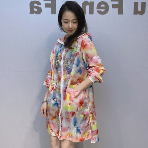 2025 Summer Floral Long Cardigan für Frauen Sonnenschutz Mittellanger, dünner Kapuzen mantel Strass steine Loose Fit Atmungsaktives Nylon